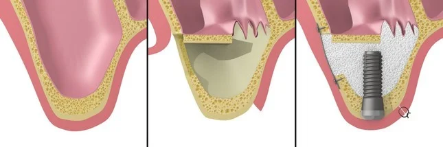 Пластика начинается с введения анестезии. Это позволяет предотвратить болевые ощущения от последующих действий. Затем врач подготавливает материал. Он может быть искусственного происхождения либо взят у животного или человека с различных участков челюсти. После этого проводится непосредственно пластика с наращиванием выбранного материала. Чтобы он полностью соединился с костной тканью, требуется примерно 6 месяцев.