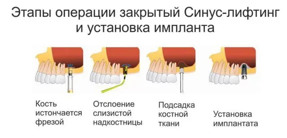 - Синус-лифтинг. Данная пластика костной ткани подразумевает приподнимание дна гайморовой пазухи и ее заполнение особым наполнителем из синтетического материала. Операция различается по закрытому и открытому типу. Это зависит от метода проведения коррекции дна гайморовой пазухи.